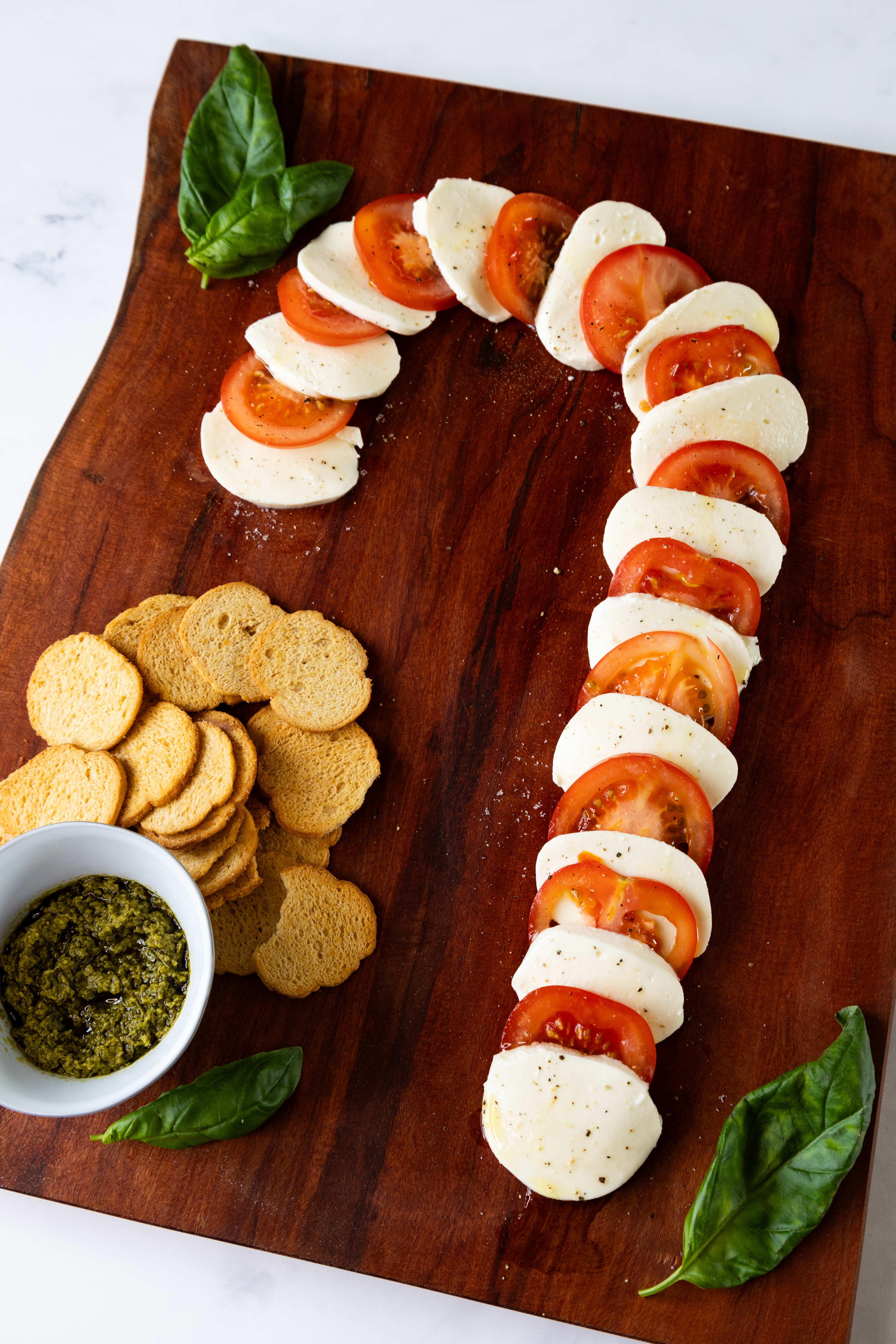 - Leg op een grote serveerplank, de mozzarella en tomaat om en om in de vorm van een zuurstok.