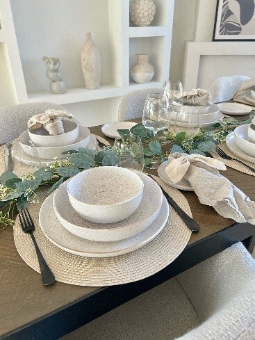 - Ton sur ton tafelen: servies in één kleurfamilie met kleine variaties in tint en textuur. Denk aan crème, zand en beige die samen een rustige, luxe basis vormen en perfect matchen met natuurlijke materialen.