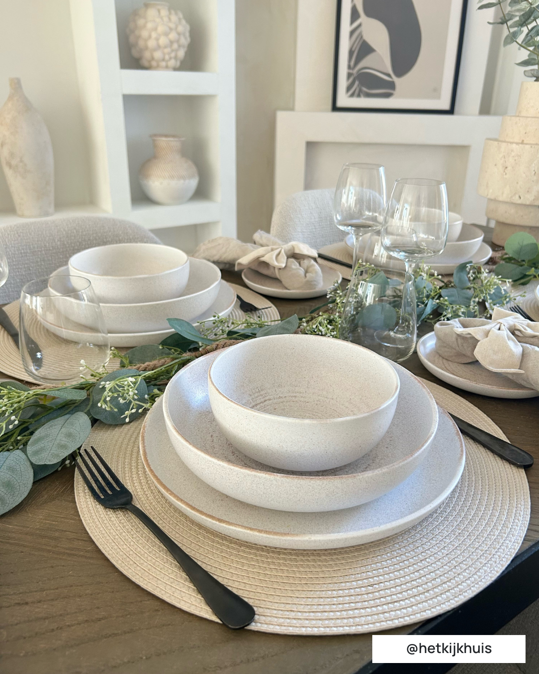De Dune serviesset heeft een rustige uitstraling met een modern karakter. De matte afwerking en natuurlijke tinten zorgen voor een zachte, verfijnde look die perfect past bij een eigentijdse Japandi tafel. Dankzij de minimalistische vormgeving en aardse kleuren vormt dit servies een harmonieus geheel dat moeiteloos aansluit bij een serene en natuurlijke tafelsfeer.