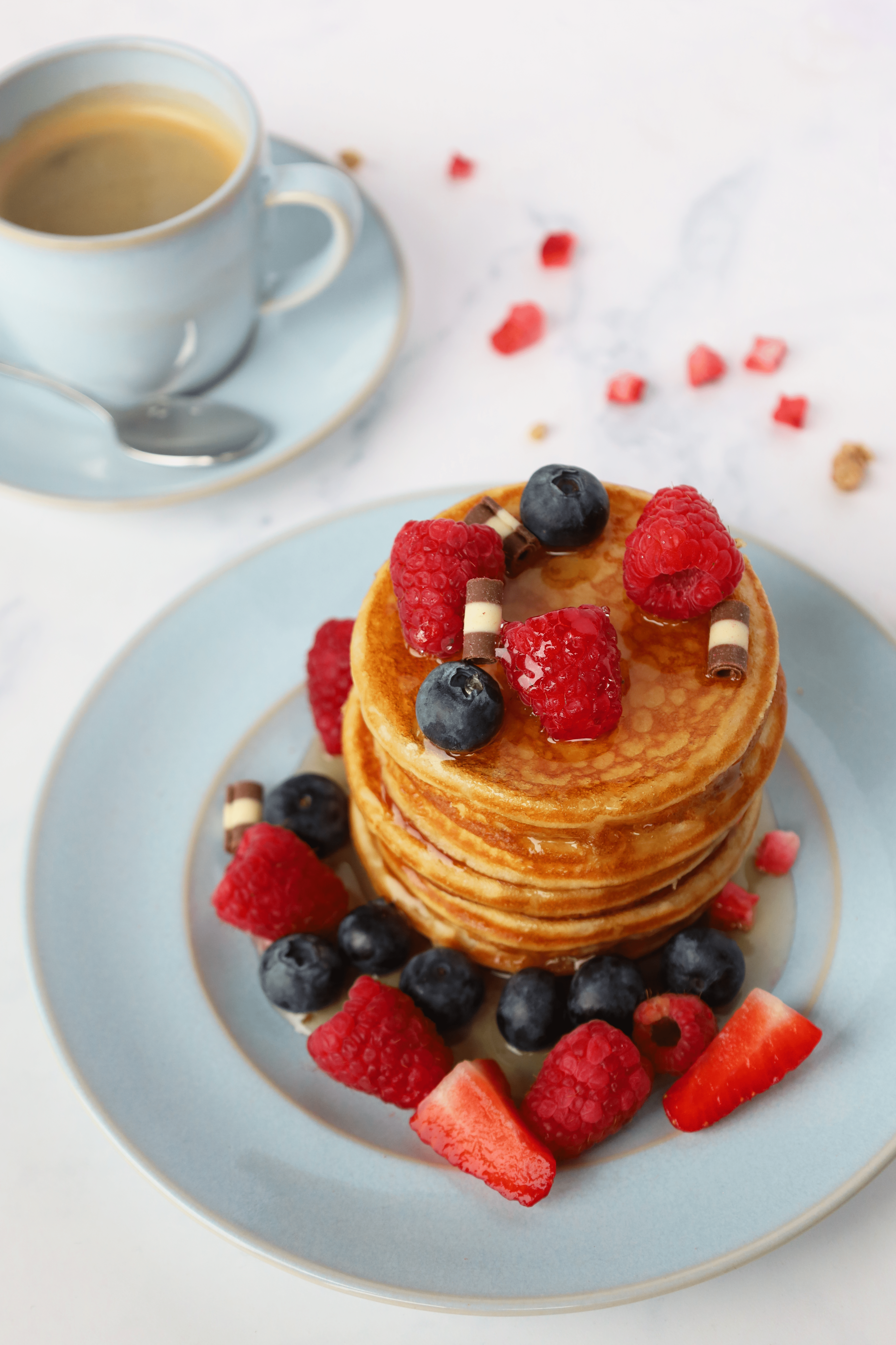 - Staple die Pfannkuchen auf einen Teller und garniere sie mit roten Früchten.