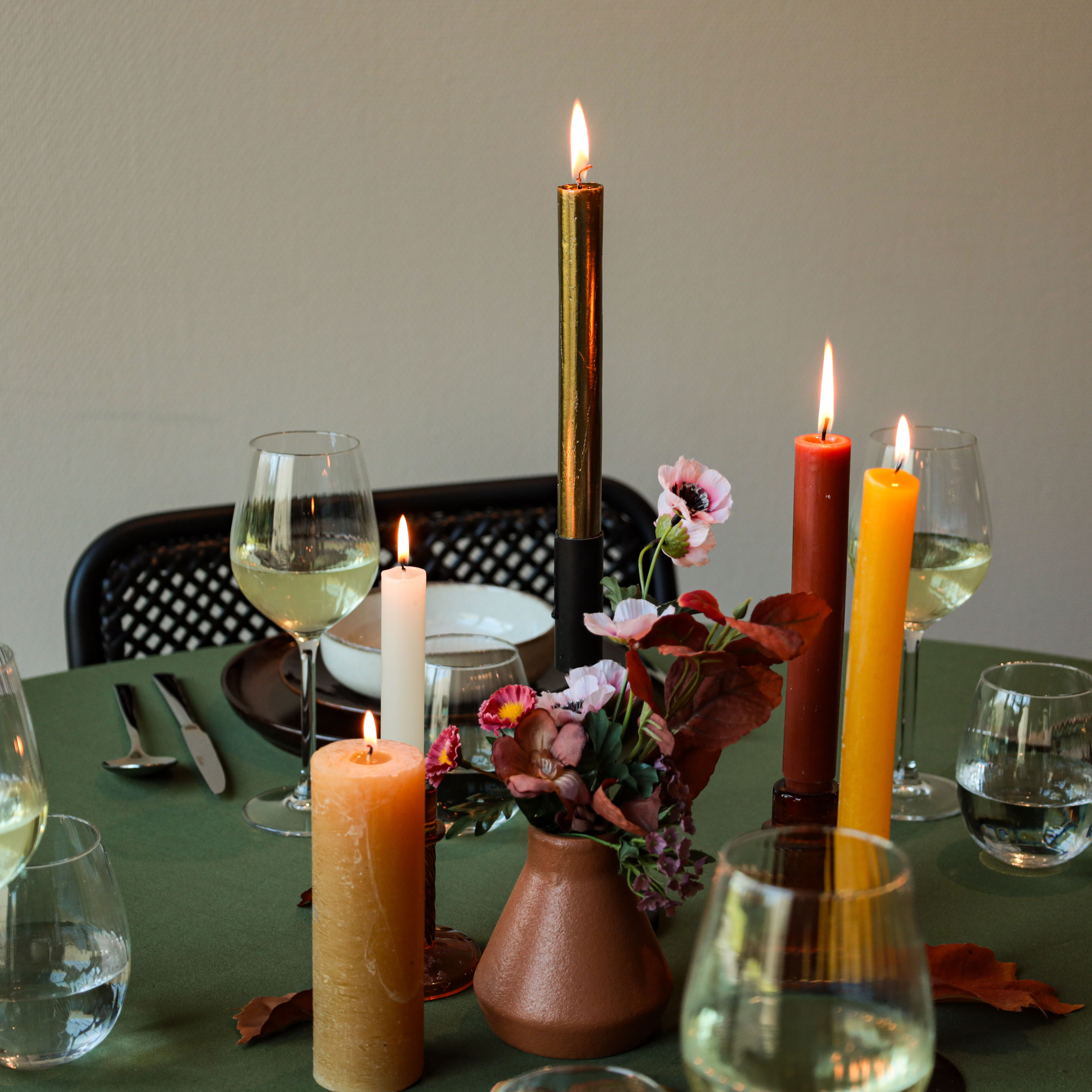 No autumn table without candlelight. The gentle flickering of flames instantly gives your dinner an intimate and warm feel. Place tall dinner candles in deep hues such as bordeaux or ochre yellow next to robust block candles in warm earth tones. By using candles in different heights, you create dynamism and depth on the table. Add any subtle light garlands for an extra touch of magic. This will create the perfect ambient light for your autumn table, turning every meal into a special moment.